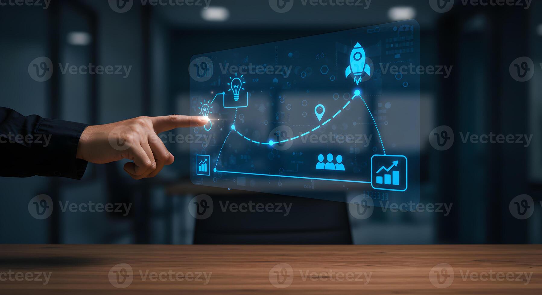 Hand pointing at a futuristic holographic display showing a business growth process with icons of idea location team and a rocket launching symbolizing innovation and success in a modern office settin Pro Photo