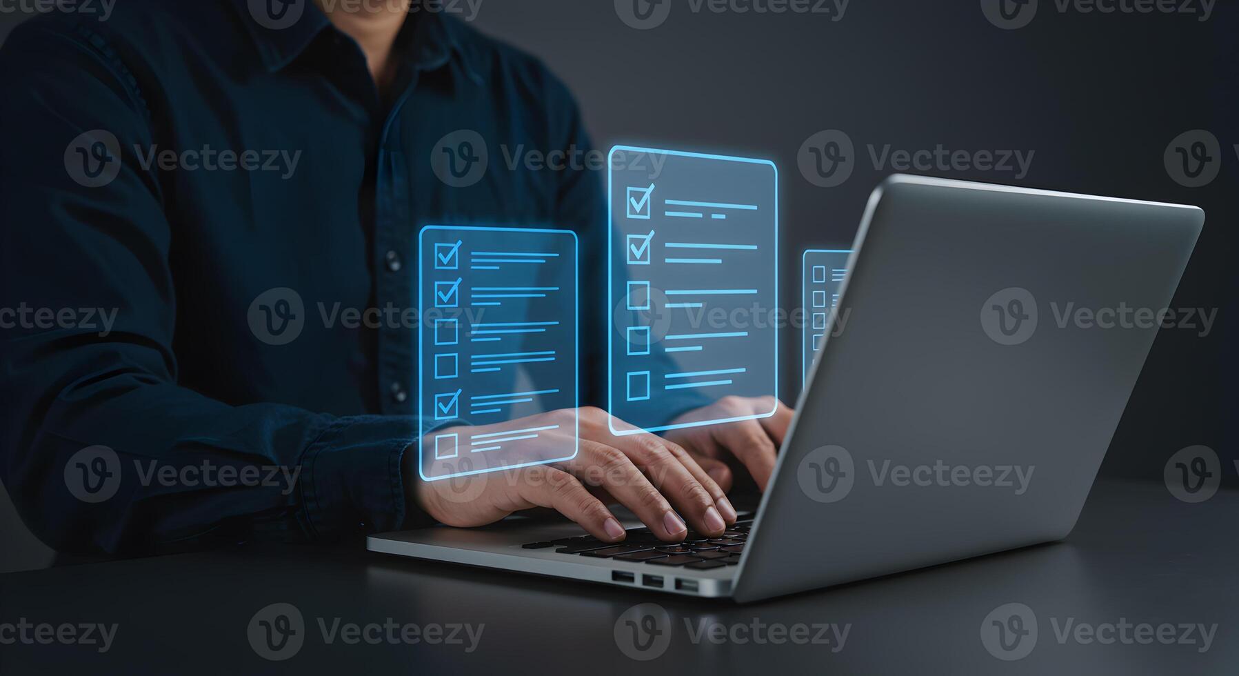 Person working on laptop computer with digital checklist reviewing tasks and managing todo list in a modern office achieving goals and productivity concept Pro Photo