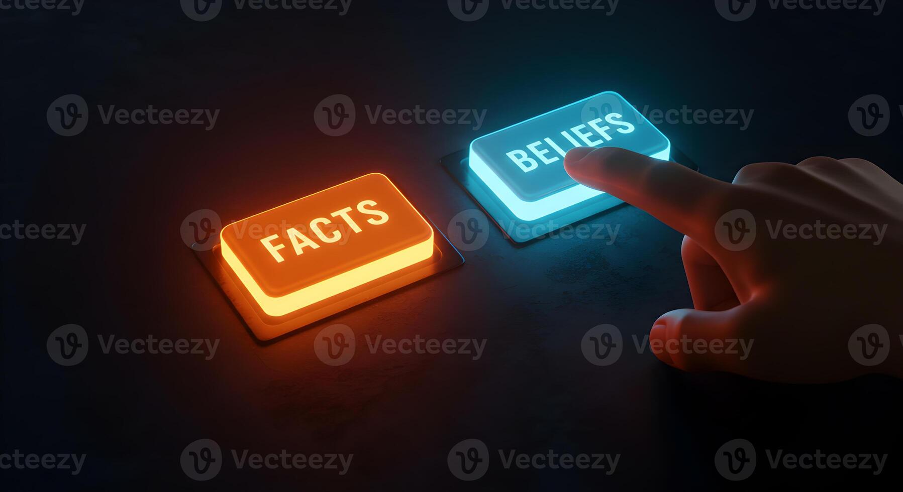 Hand pressing illuminated button labeled Beliefs next to another button labeled Facts a conceptual image representing the choice between objective truth and subjective belief set against a dark backgr Pro Photo
