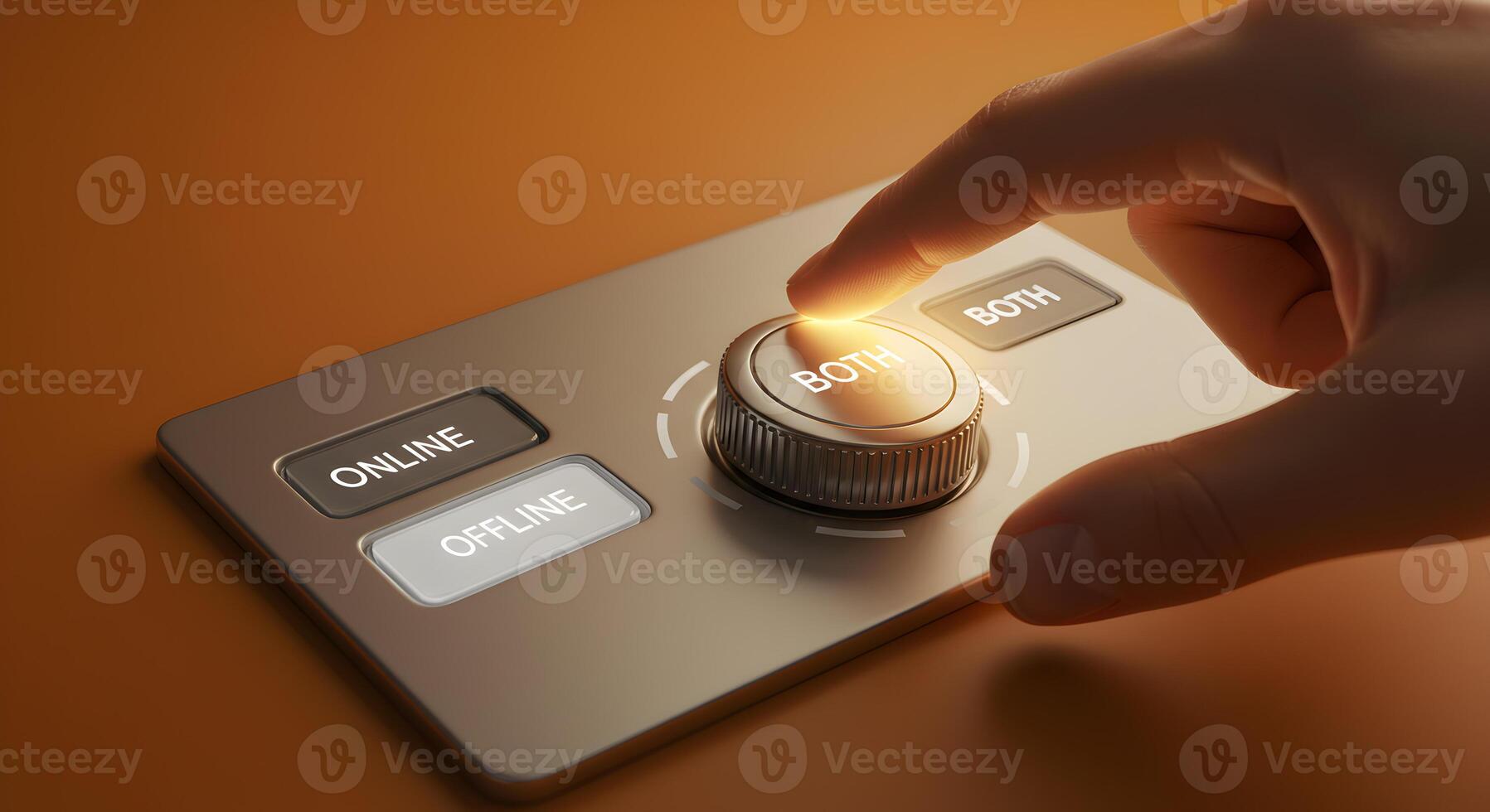 Hand activating a metallic switch selecting both online and offline options symbolizing a blend of digital and physical strategies for business or marketing in a warm and inviting setting This image c Pro Photo