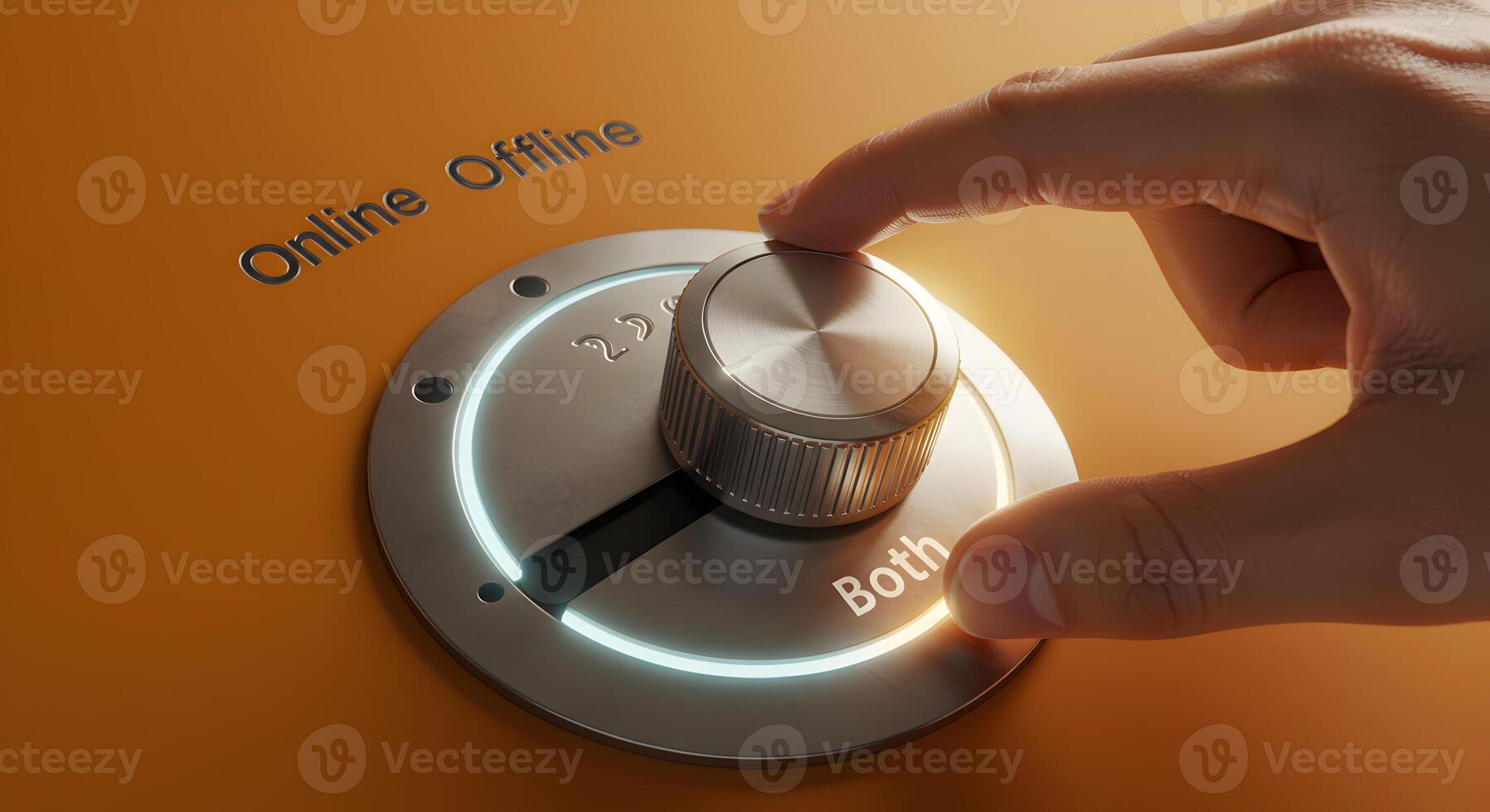Hand turning a dial switch from Offline to Both symbolizing the balance between online and offline life a concept of modern worklife integration and digital wellbeing The image is set against a vibran Pro Photo