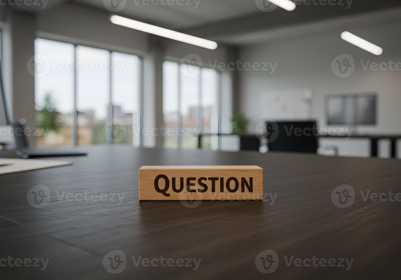 Wooden block with the word QUESTION on a modern office desk near large windows signifying inquiry query doubt and the search for answers Pro Photo