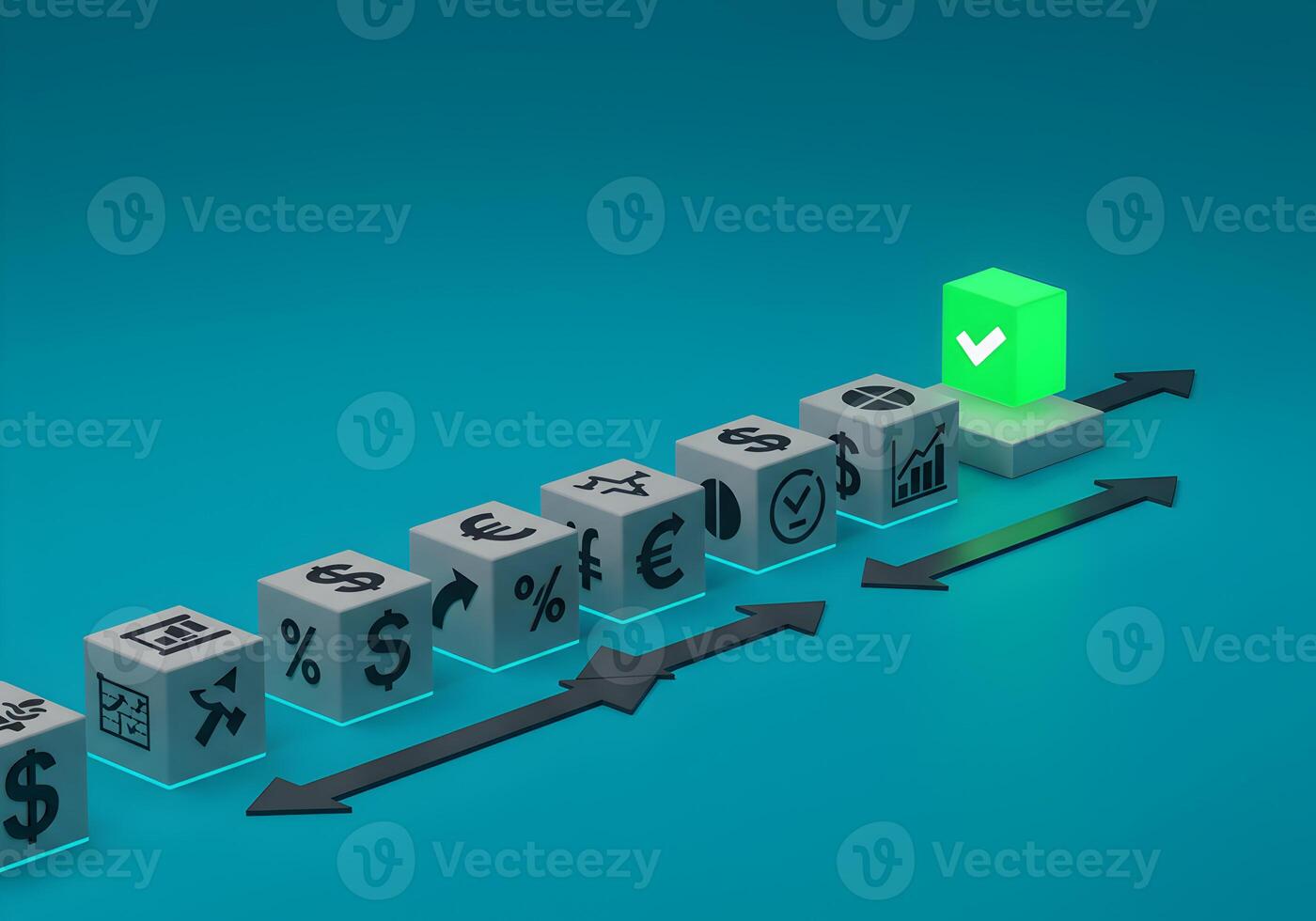 Abstract 3D rendering of financial growth and success Cubes with currency symbols and financial icons progressing towards a green checkmark cube symbolizing achieving financial goals and milestones on Pro Photo