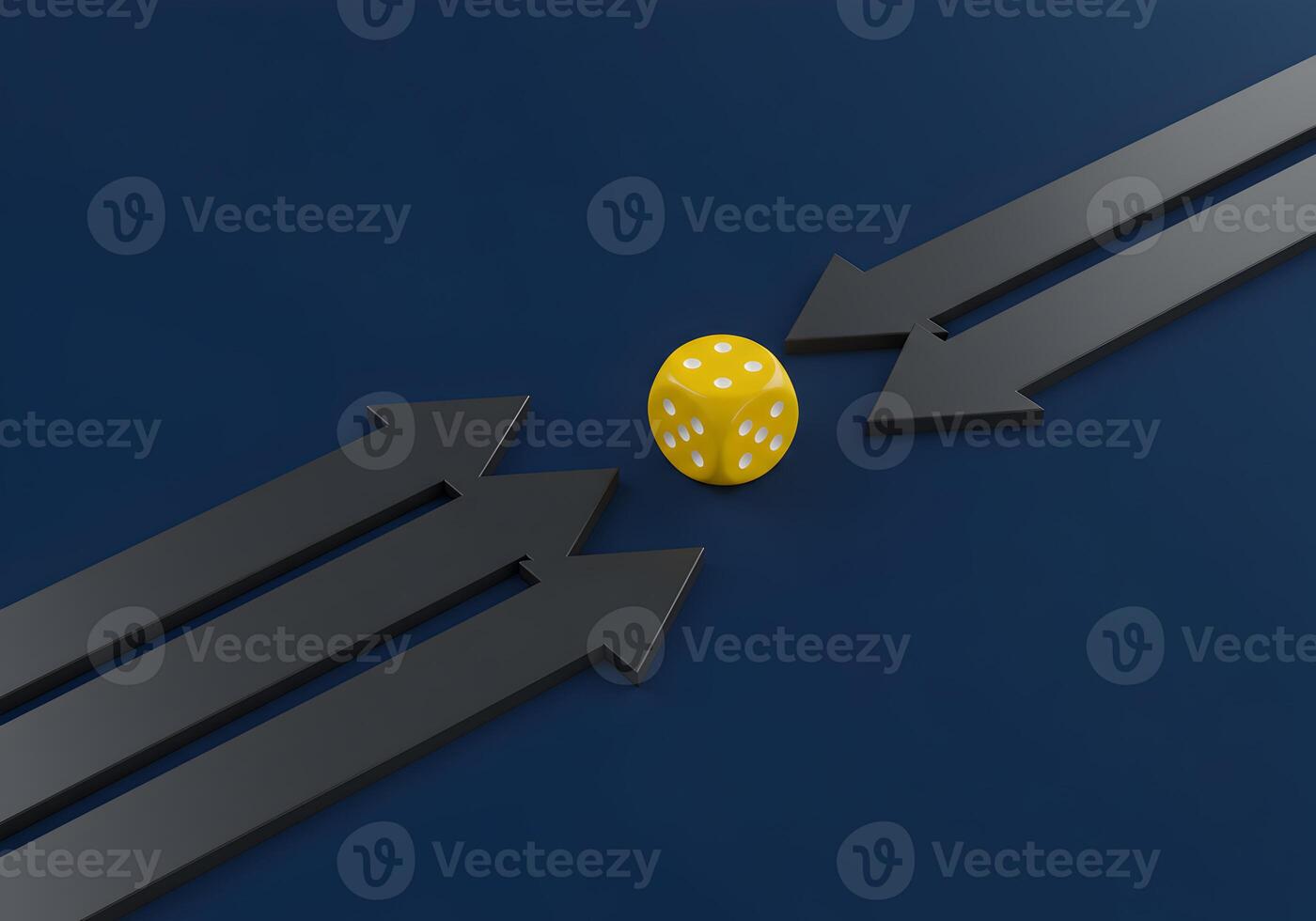 Yellow Dice Between Three Diverging Black Arrows on a Dark Blue Background Symbolizing Choice Risk and the Uncertainty of Multiple Paths Ahead Pro Photo