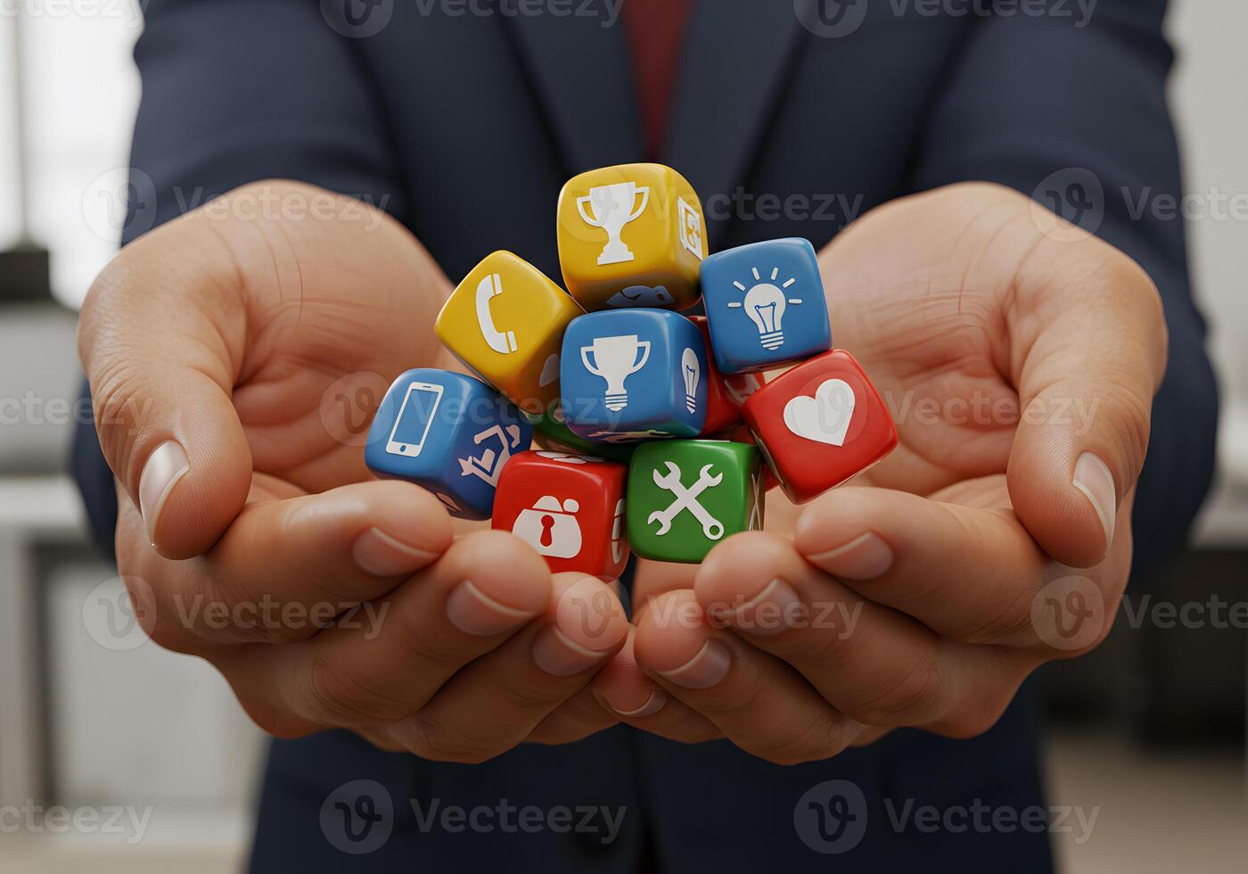 Businessman Holding Colorful App Icons on Cubes Symbolizing Innovation and Success in a Modern Office Setting The image depicts a diverse range of app functionalities including communication idea gene Pro Photo