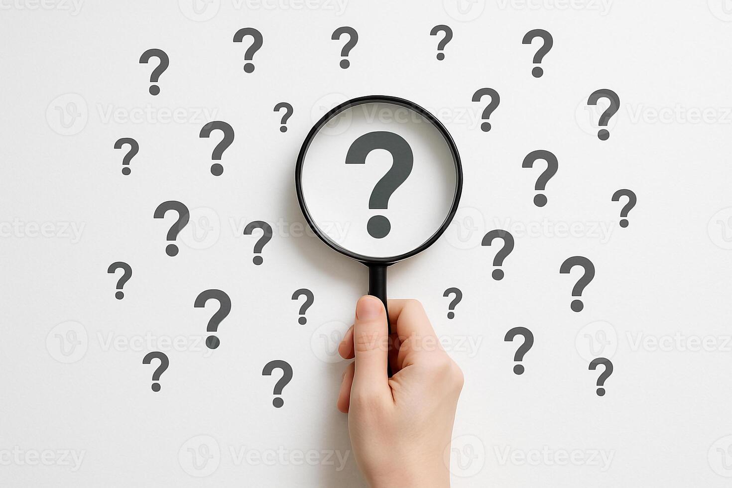 Hand holding magnifying glass focusing on a question mark among many question marks on white background - concept of searching for answers solving problems finding solutions uncertainty and questionin Pro Photo
