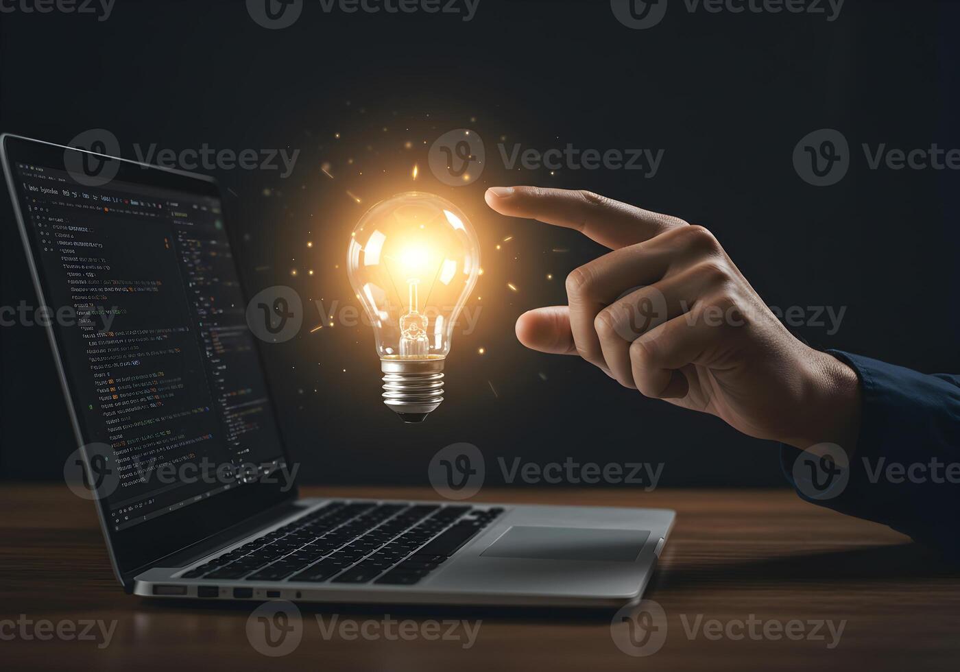 Hand pointing at glowing lightbulb above laptop screen displaying code symbolizing innovative software solution digital workspace concept Pro Photo