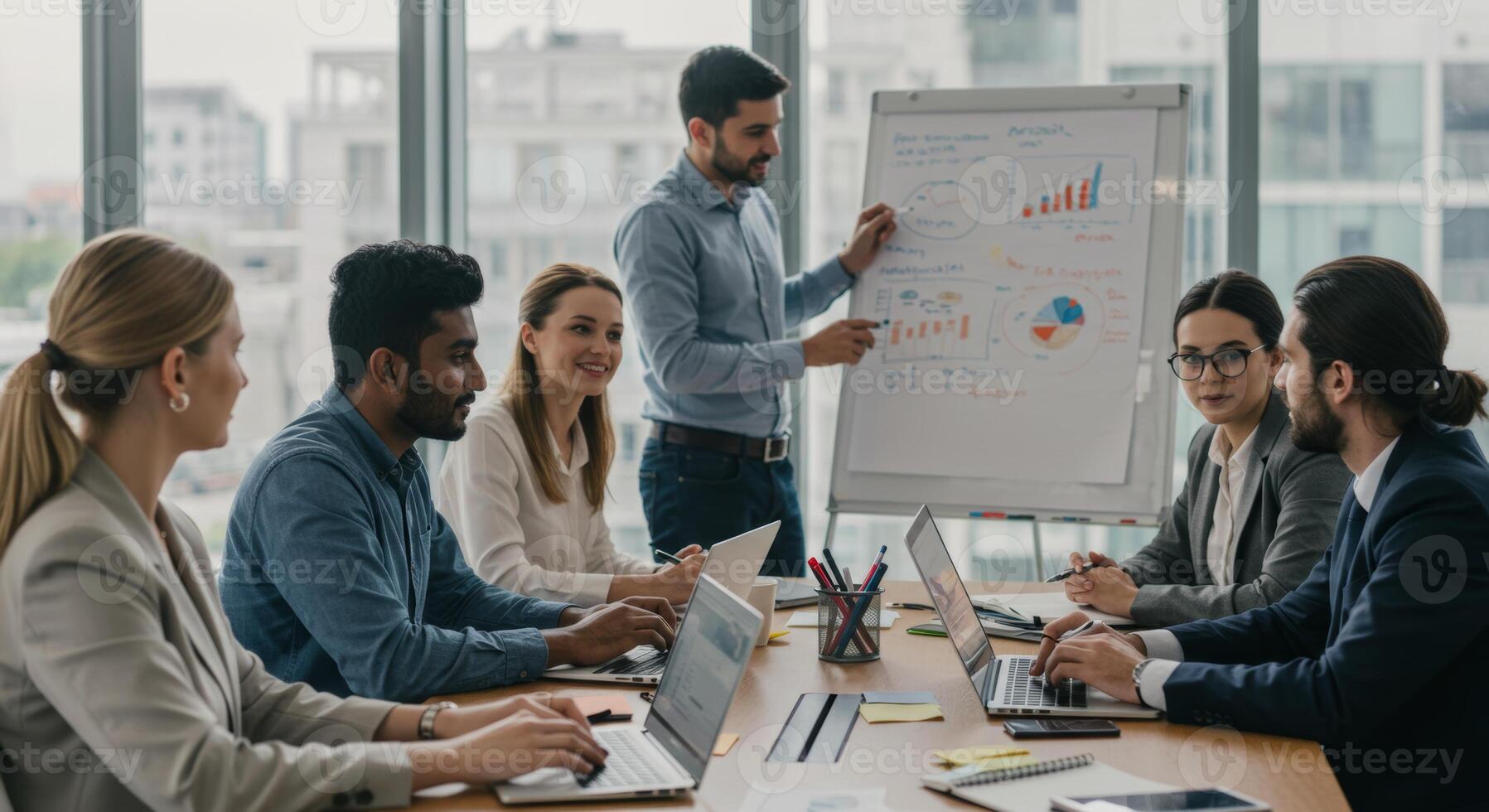 Business meeting presentation discussing data analysis and marketing strategy in office space setting Pro Photo
