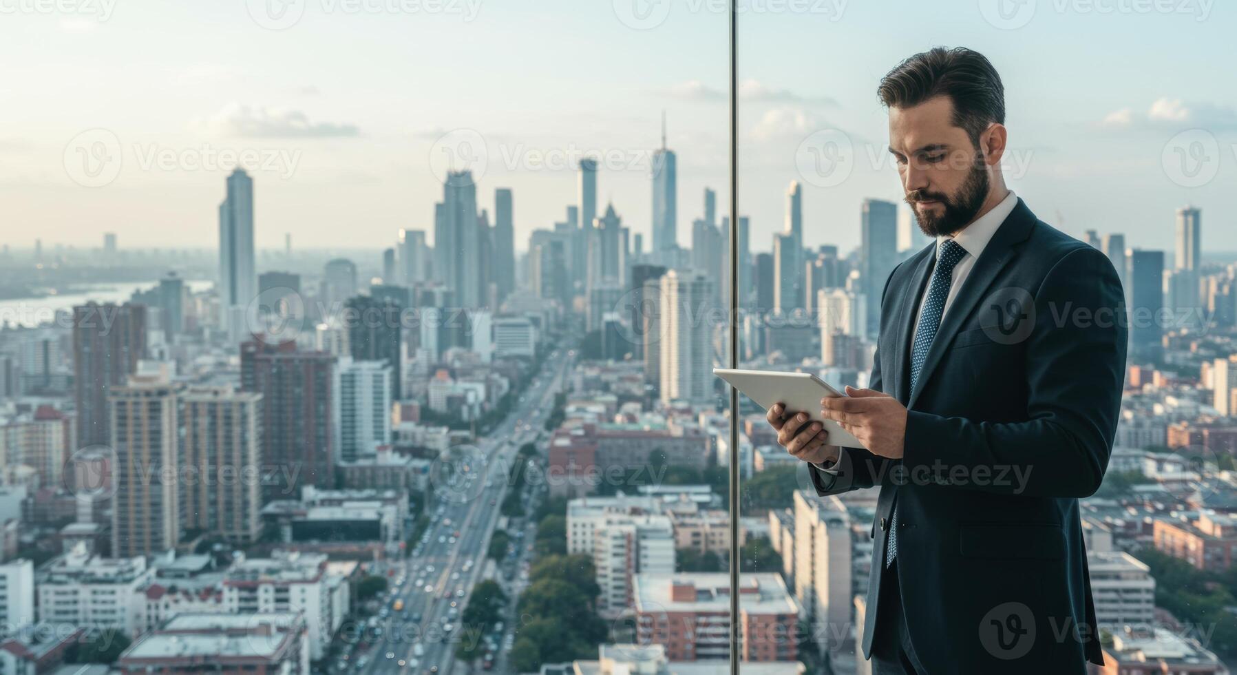 Businessman using tablet in office with city view corporate executive working on technology in skyscraper Pro Photo