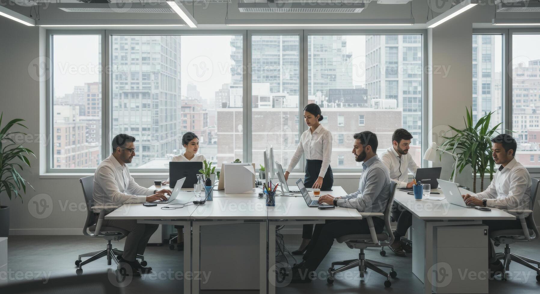 Modern office space with diverse team working collaboratively on laptops and computers at desks Pro Photo