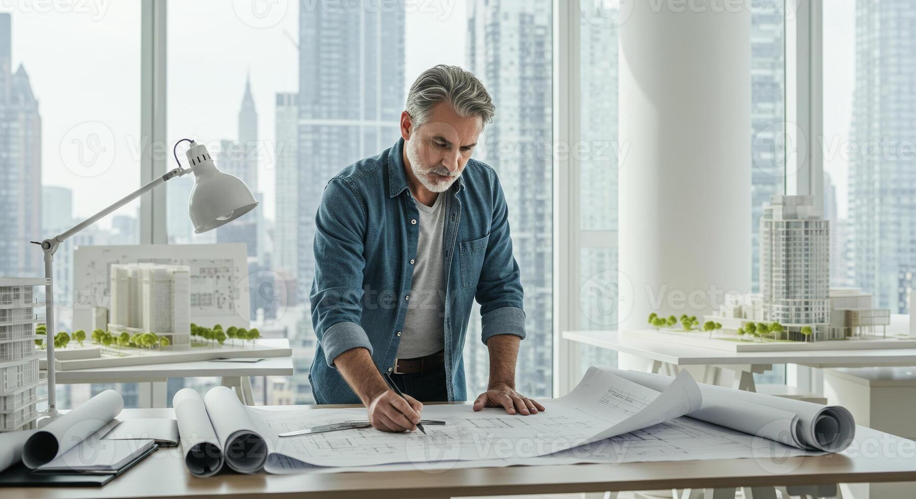 Architect working on blueprints in his office, sketching a new building design. Pro Photo