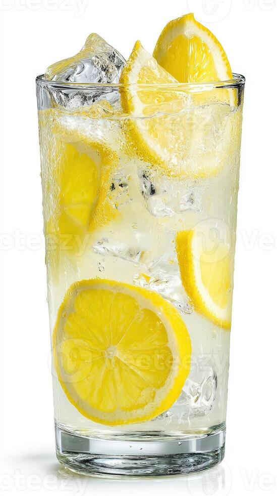 A refreshing glass of lemonade with ice cubes and lemon slices on a white background isolated Pro Photo