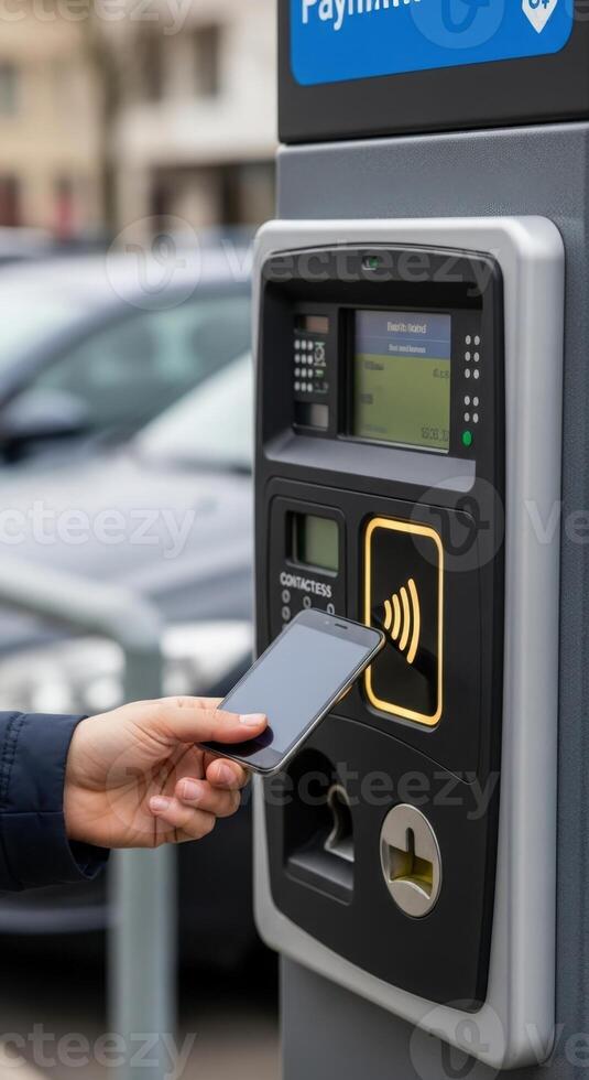 Person using a smartphone to pay at a parking meter with a car visible in the background outside Pro Photo