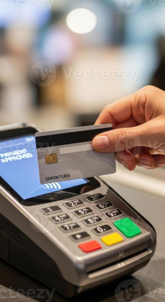 Person using contactless payment with a card on a pos terminal for a transaction in a store Pro Photo