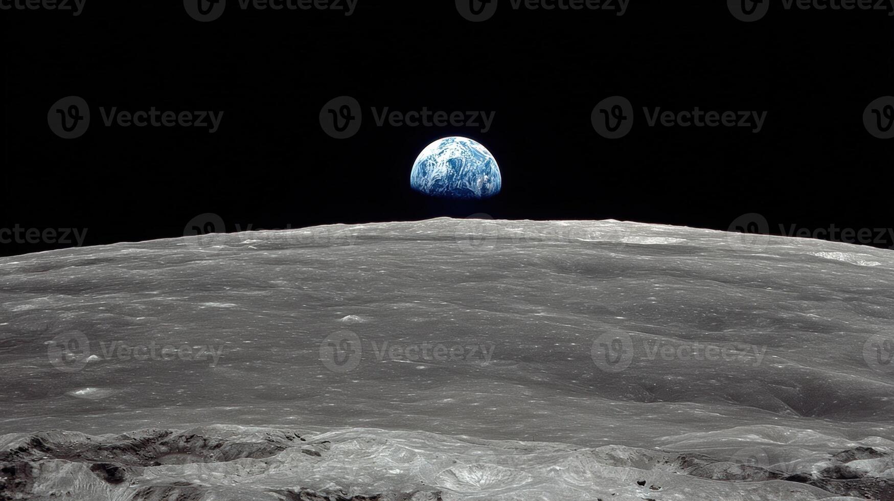 A view of planet from the lunar surface with craters and a dark sky above the horizon line in the distance Pro Photo