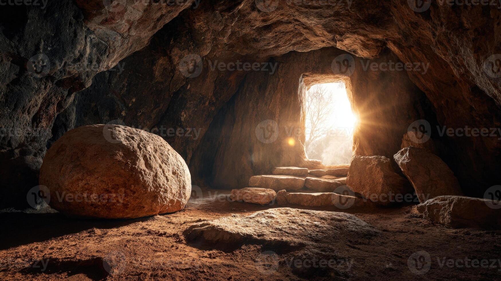 View of a stone cave with a large boulder and a bright light at the exit of the cave passage Pro Photo