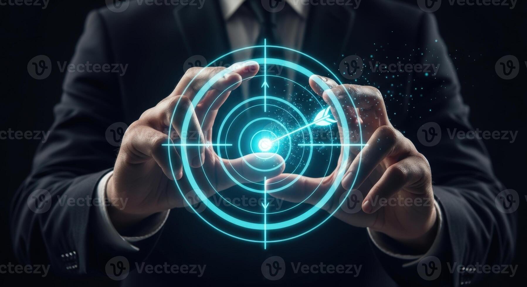 Man in suit holding a glowing target with an arrow in the center in a dark studio setting Pro Photo