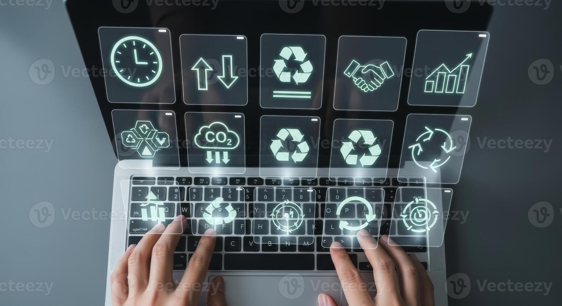 Person using laptop with sustainable development icons displayed in a digital interface above the keyboard Pro Photo