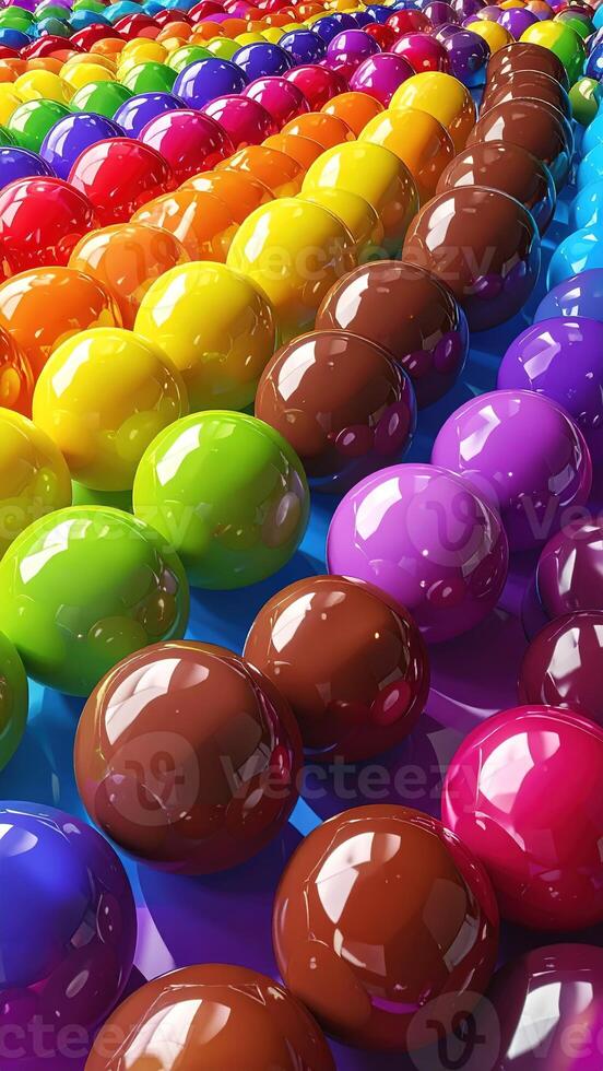 A vibrant display of glossy spheres in a spectrum of rainbow colors, creating a mesmerizing pattern on a dark blue surface. Pro Photo