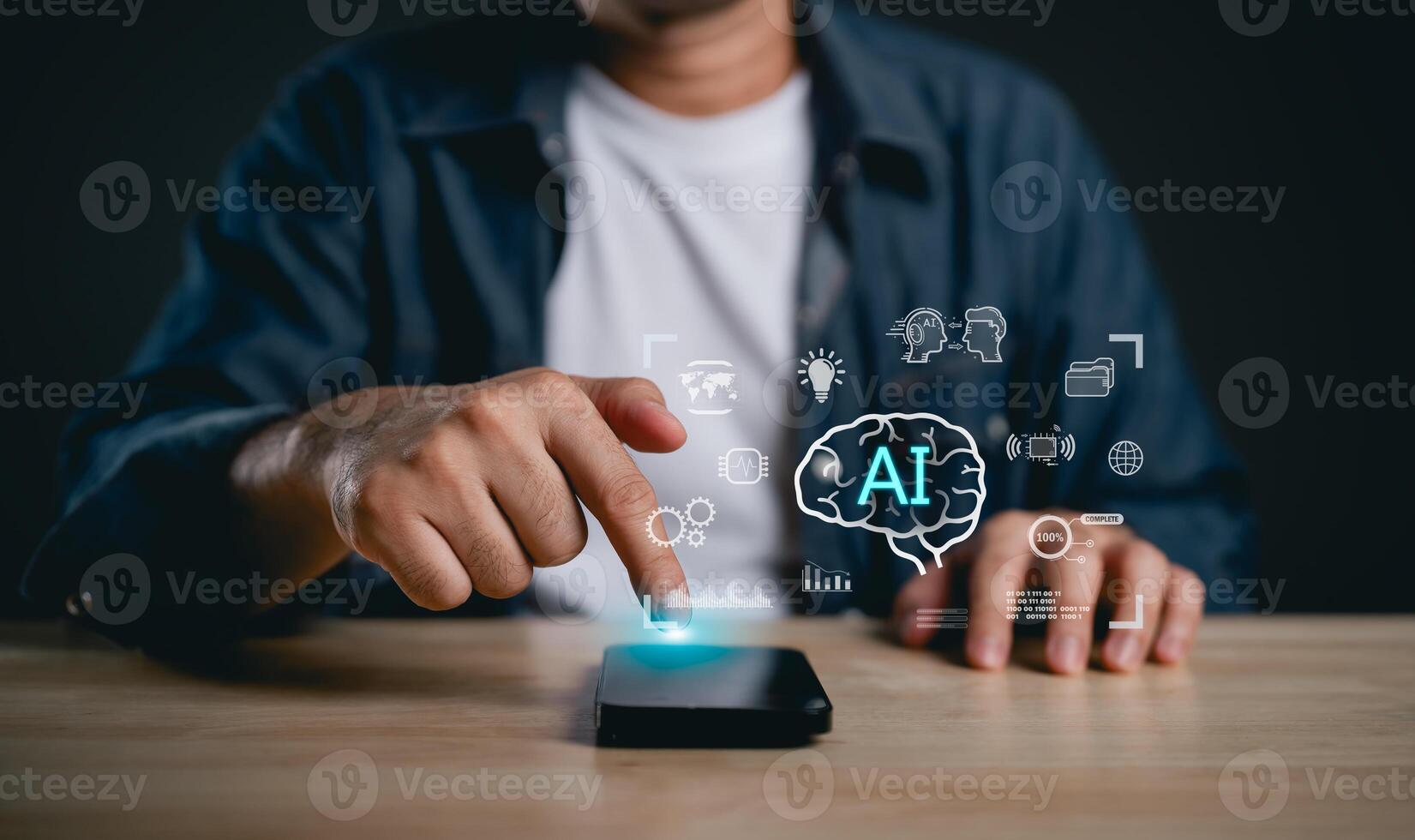 Hand of a person interacting with smartphone displaying artificial intelligence concepts, highlighting technology and innovation in digital communication Pro Photo