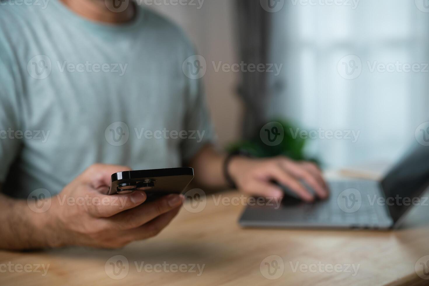 Man in Casual Shirt Using Smartphone While Working on Laptop at Home Office Table with Natural Light from Window and Greenery in Background Pro Photo
