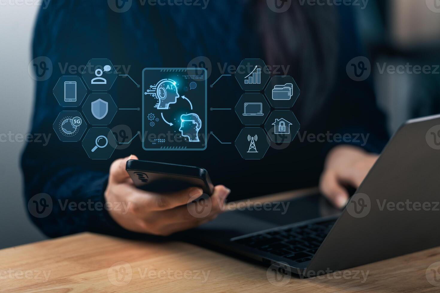 A person engages with a smartphone and a laptop, displaying AI technology and data visualization. The scene represents modern workspace innovation and digital communication. Pro Photo