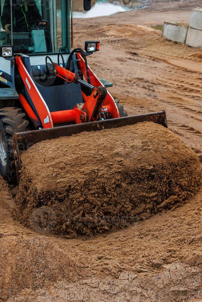 A red and white front loader operates on a dirt surface, its bucket filled with sand. Tire tracks and concrete blocks are visible in the industrial setting. Pro Photo