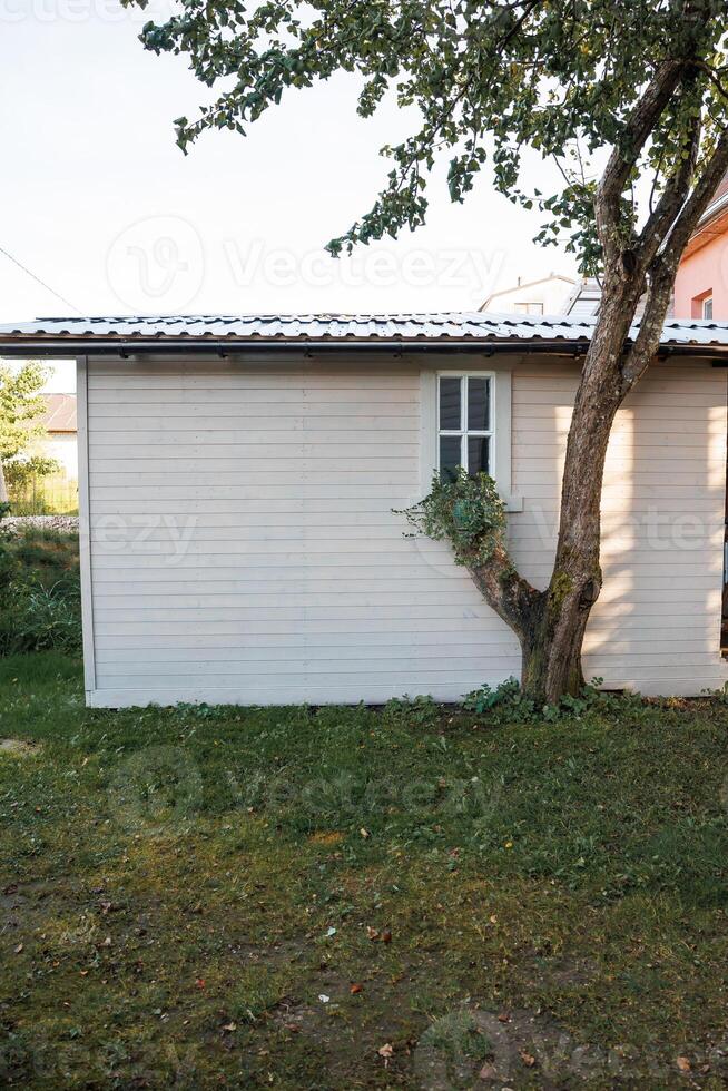A white wooden structure with a window stands near a split trunk tree. Grass covers the ground, and an orange building is partially visible on the right. Pro Photo