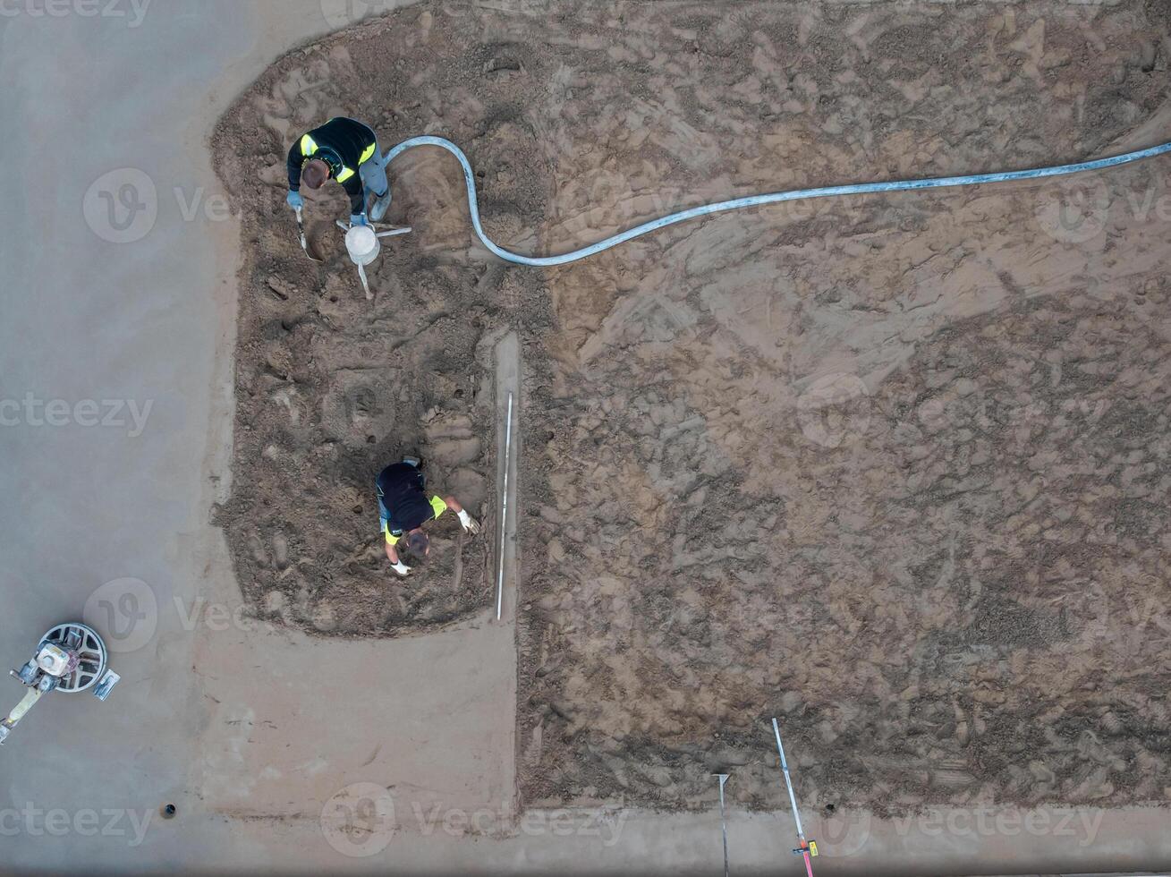 Two workers operate tools on a partially prepared surface at a construction site. Wet and dry soil, a leveling device, and poles are visible. Pro Photo
