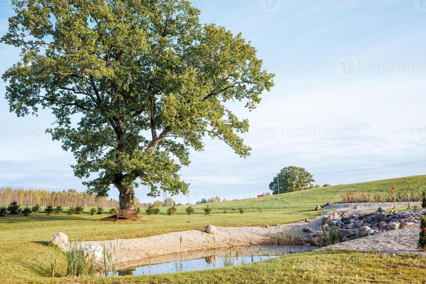 A large oak tree near a pond bordered by rocks and reeds, with a wooden bench beneath its branches. Open grassy fields and scattered trees surround the area. Pro Photo