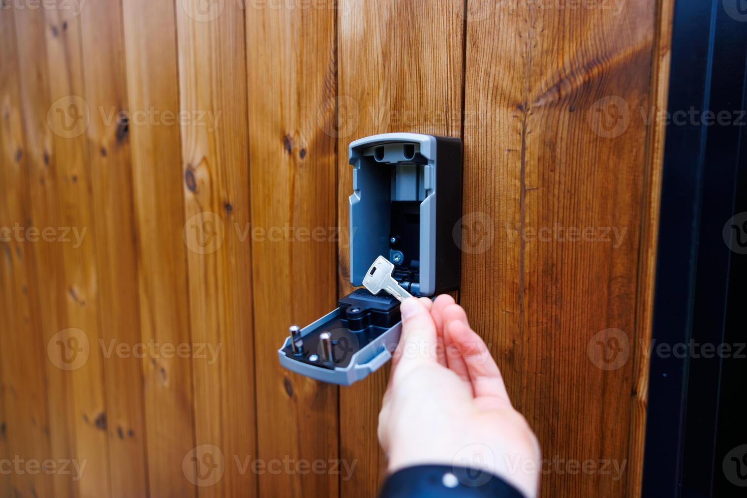 A hand in a dark sleeve retrieves a key from an open wall mounted lockbox. The polished wooden surface shows visible grain patterns, adding texture. Pro Photo