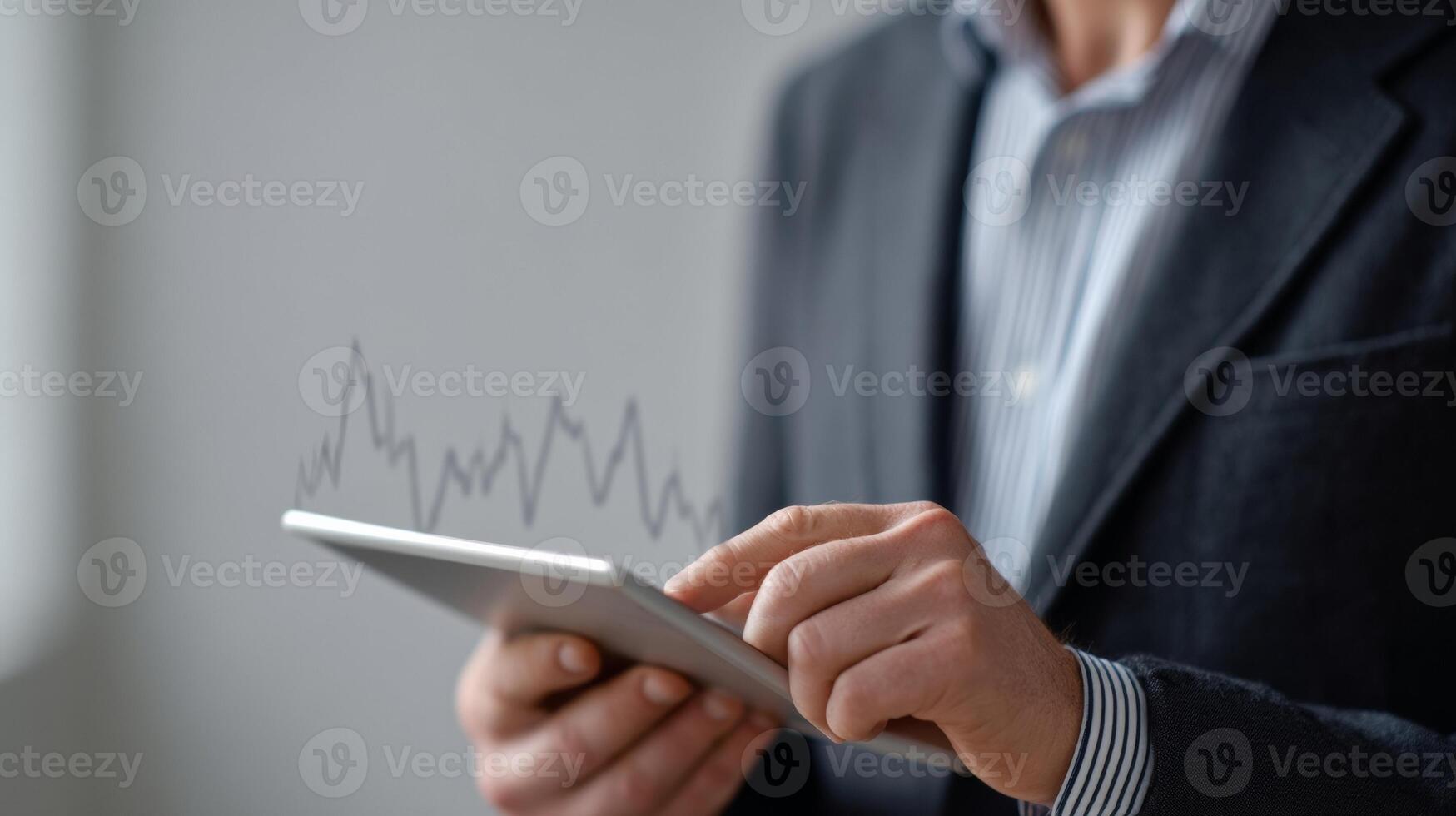 Sleek tech savvy Caucasian male navigates fluctuating data peaks on a digital tablet, resonating with Pi Approximation Day insights Pro Photo
