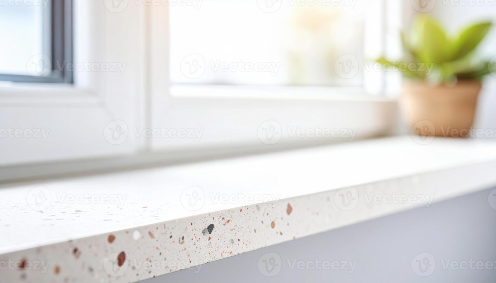 Pale terrazzo windowsill with fine micro chips feathered falloff and open copy area above calm material background for architecture branding and interior layout Pro Photo