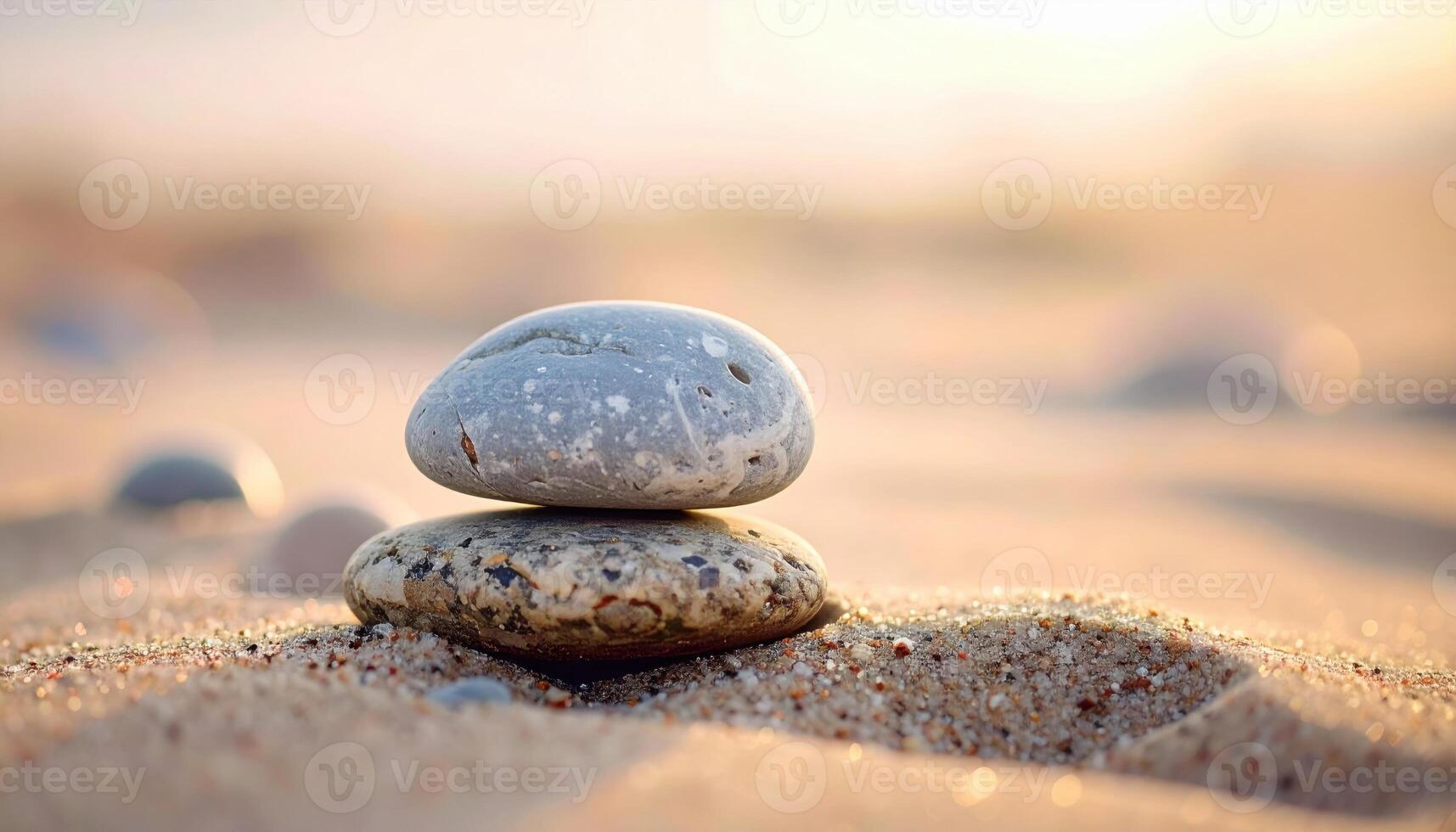 Smooth river pebble cluster partly embedded in sand soft overcast field with upper copy band calm nature texture background for banner and layout Pro Photo