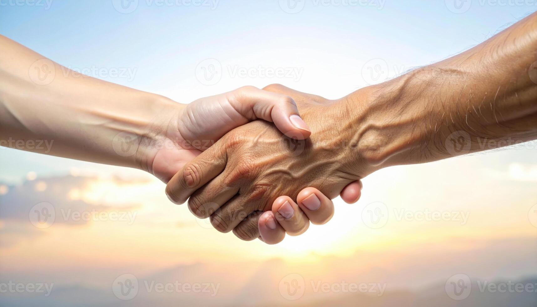 Handshake between two adults in diffuse daylight wrists and hands only minimal background with clean copy space for business partnership community and teamwork themes Pro Photo