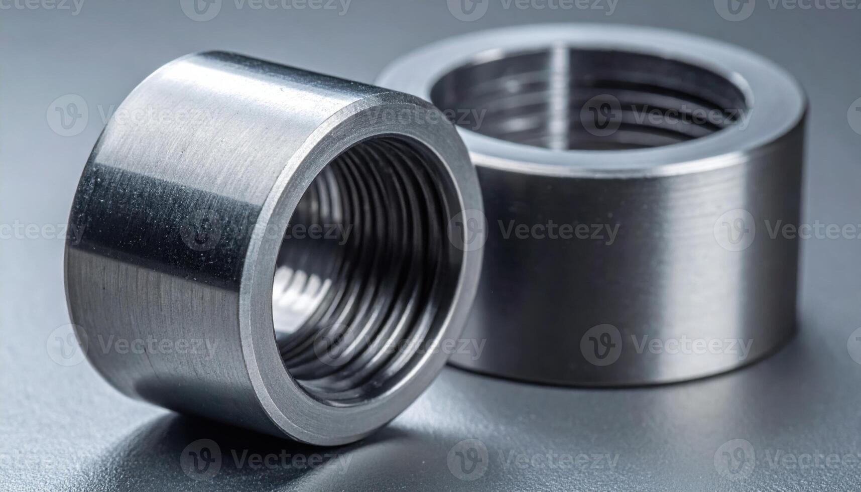 Macro two piece shaft collar with socket screws slightly loosened brushed metal finish clean technical background with copy space for catalog template and engineering layout Pro Photo