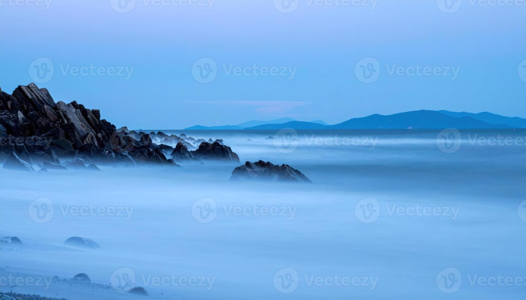 Coast fog rolling over dark sea at blue hour gentle gradient with upper third empty for text calm minimal seascape Pro Photo