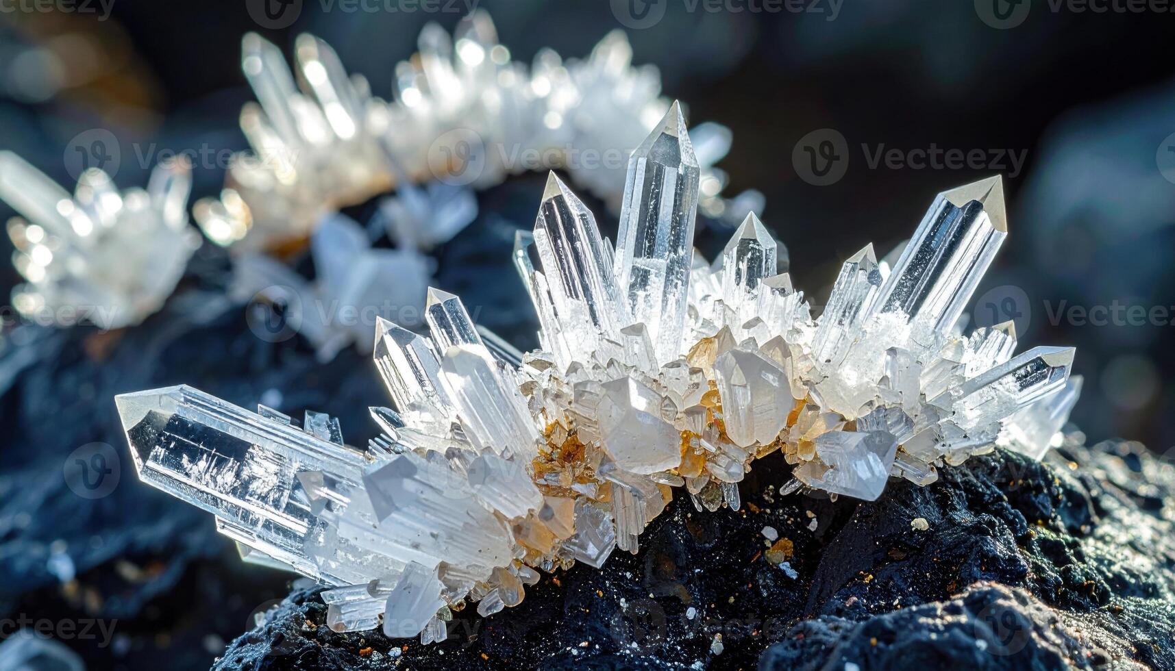 Tide pool halite crystals in starburst patterns on dark rock with bottom copy space crisp coastal science background Pro Photo