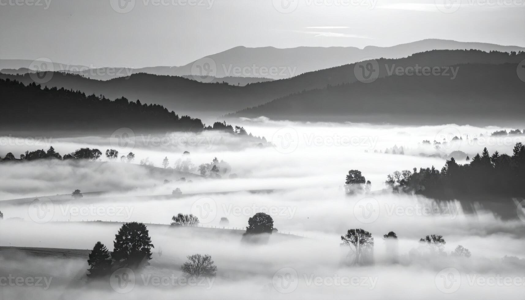 Thin ground fog pooling in a valley at predawn monochrome cool open center representing quiet landscape suitable for travel editorial weather and minimalist design Pro Photo