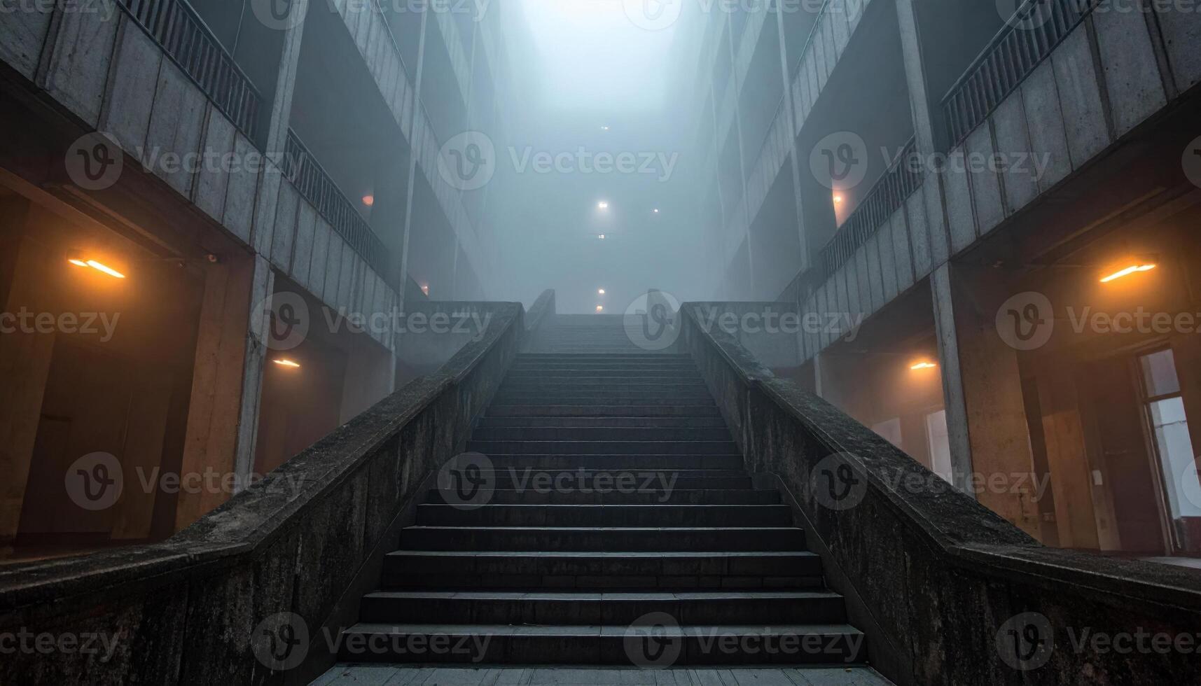 Fog seam on brutalist library stairwell with faint emergency glow representing minimal architecture mood suitable for editorial features education visuals and atmospheric design Pro Photo