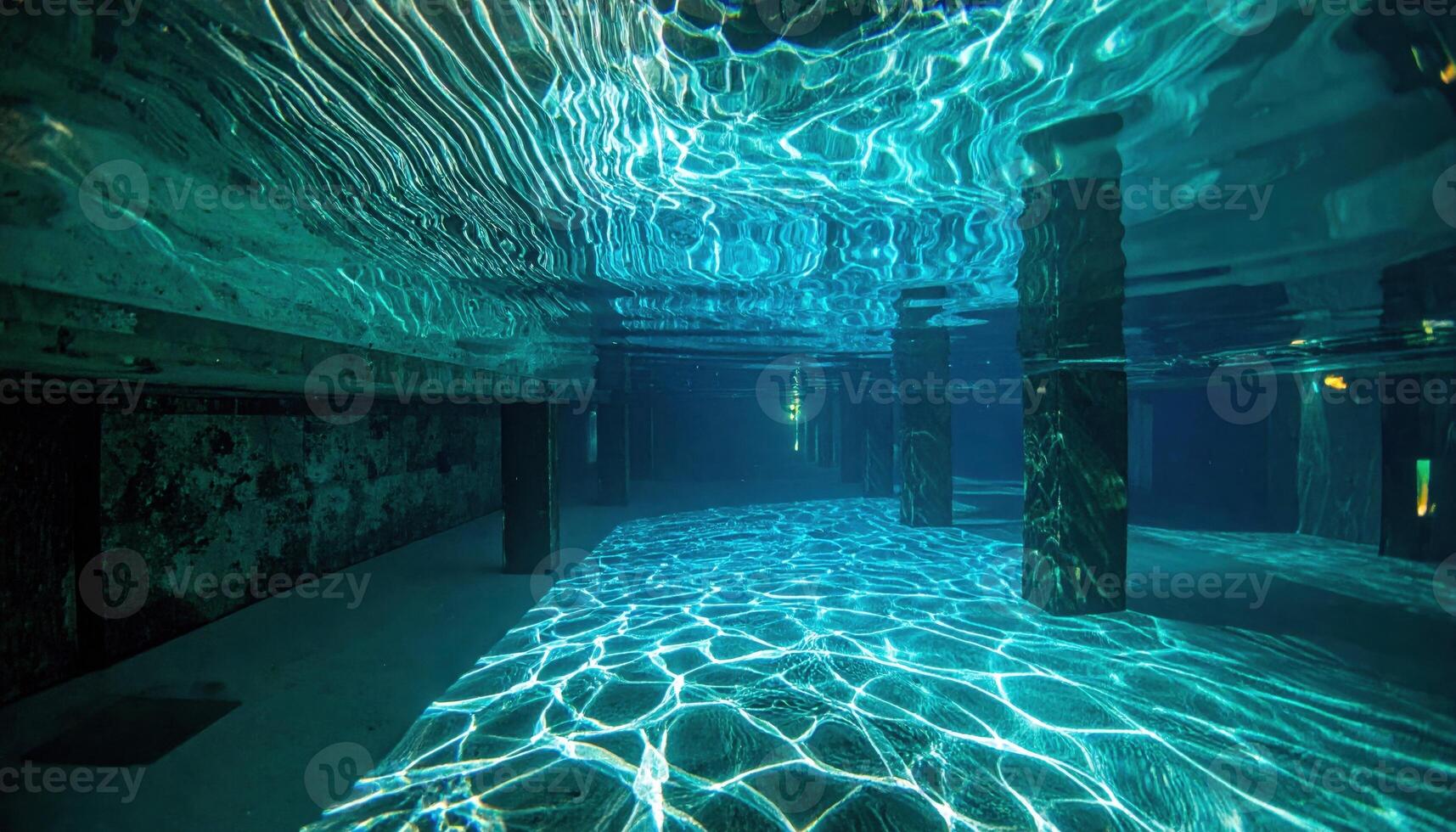 Flooded undercroft with rippling caustics and cool cyan ambience representing historic substructure space and luminous water light suitable for architecture features fantasy settings Pro Photo