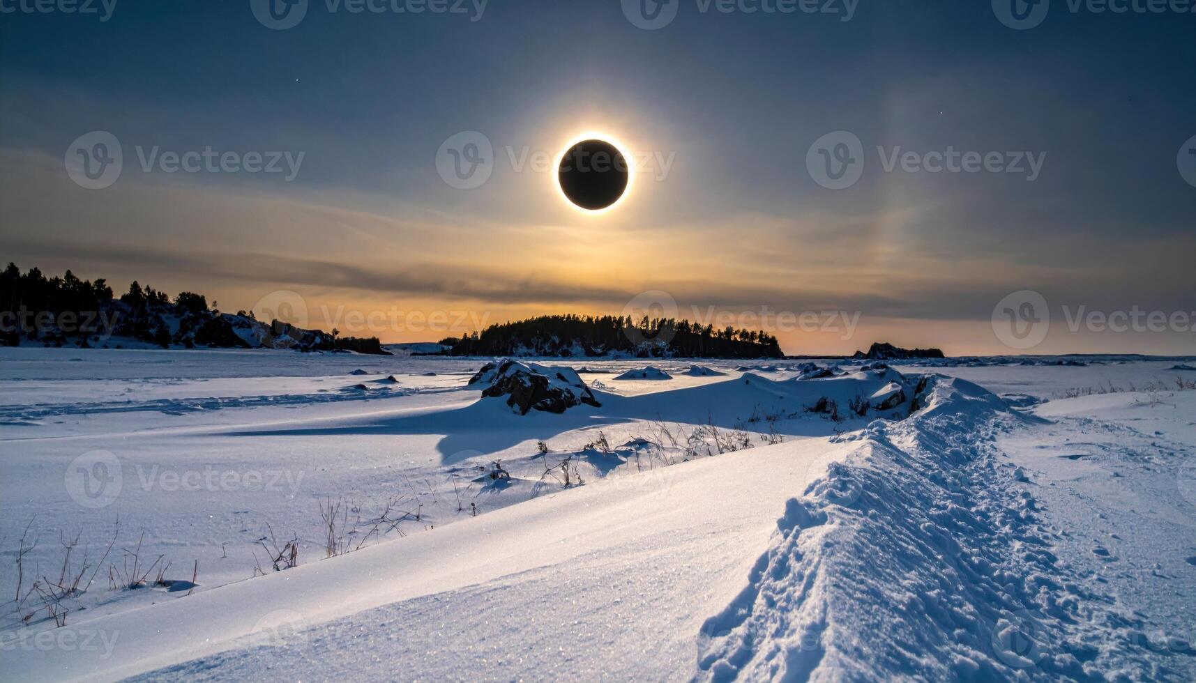 Lunar eclipse penumbra over frozen plain with rimlit snow crust representing celestial winter minimalism and quiet space suitable for astronomy education editorial features and serene design Pro Photo