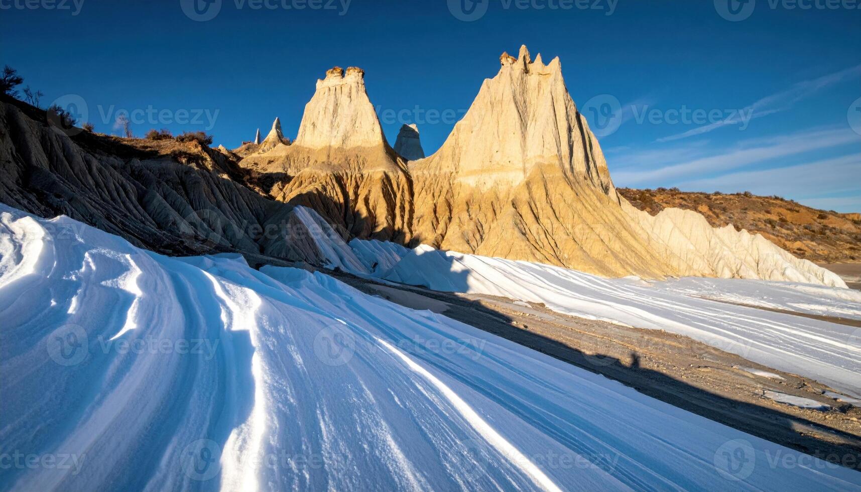 Ice penitentes to sastrugi crest with razor shadows in cobalt light representing sculpted alpine snowforms and austere highland mood suitable for science features mountaineering education Pro Photo