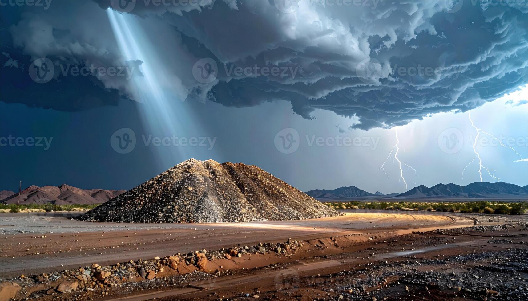 Cinematic desert industry photo of a rail ballast stockpile under thunder, angular aggregate lit by a spotlight gap in the cloud for stark contrast. Pro Photo