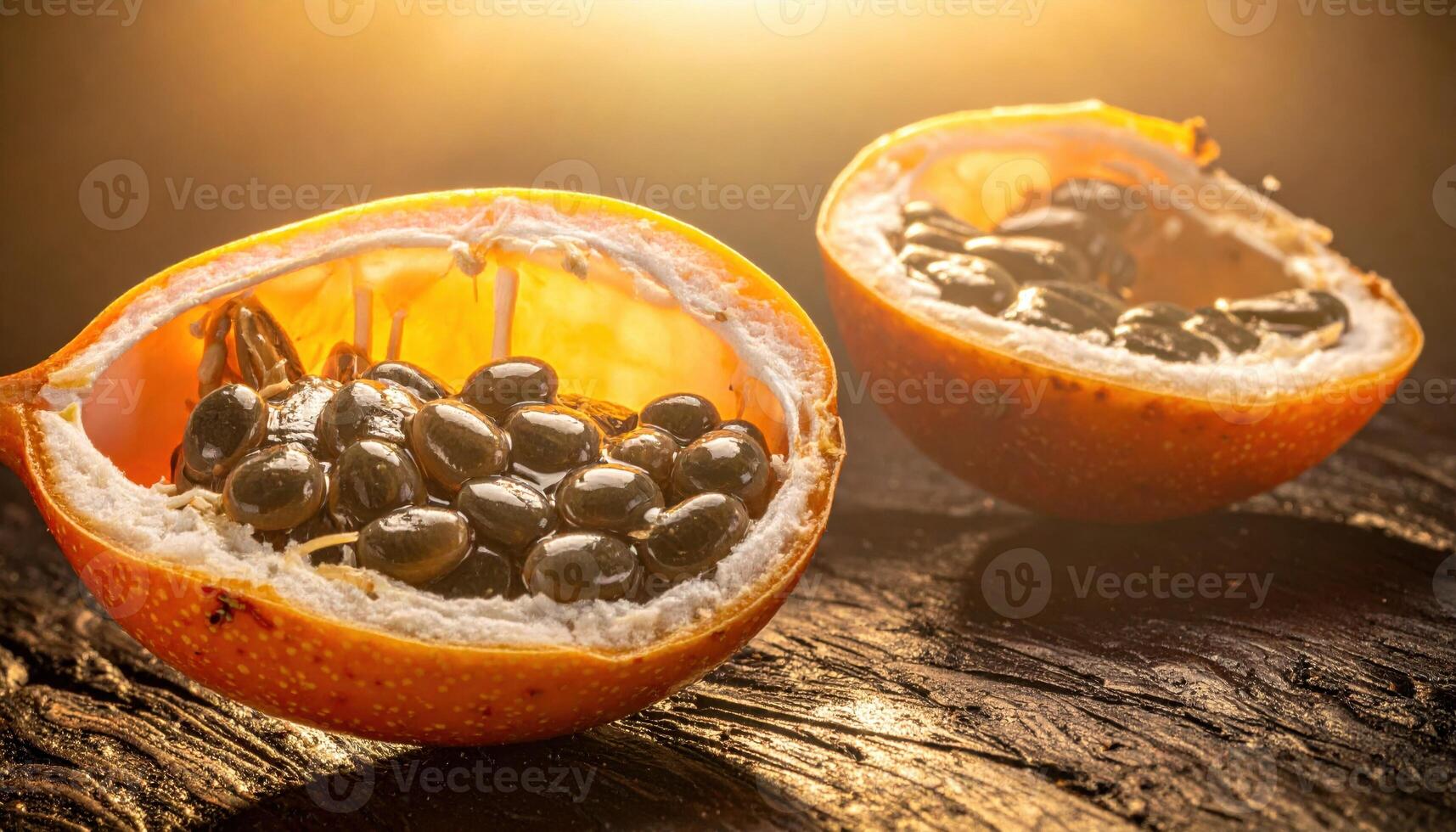 Cinematic studio photo of granadilla shells lit from within by a low lamp, quiet amber glow and deep vignette for refined dessert styling. Pro Photo