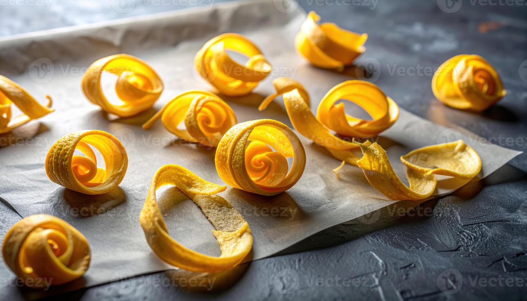 Bergamot peel twists scattered sparsely on graphite paper with a faint top glow refined citrus still life for culinary editorials fragrance stories and branding Pro Photo
