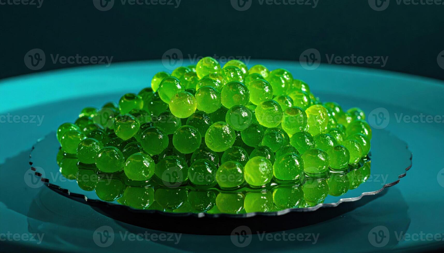Finger lime pearls spilling across a cold mirror plate with crisp rim light and soft teal falloff refined citrus macro for editorial and sleek menu design Pro Photo