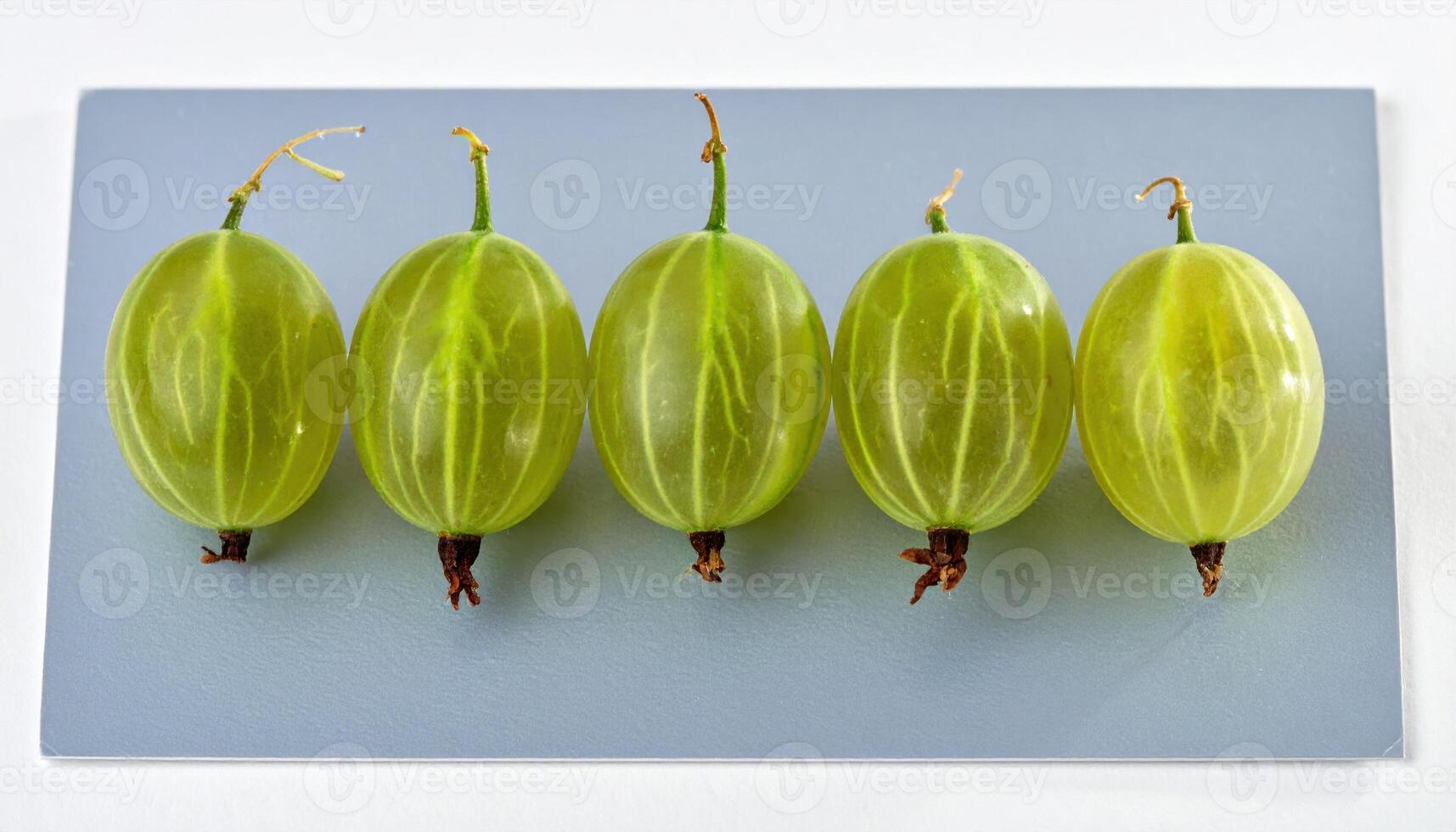 Gooseberries lined along a threadlike stem on cool grey card with tiny specular points refined fruit still life for editorial menus and fresh branding layouts Pro Photo