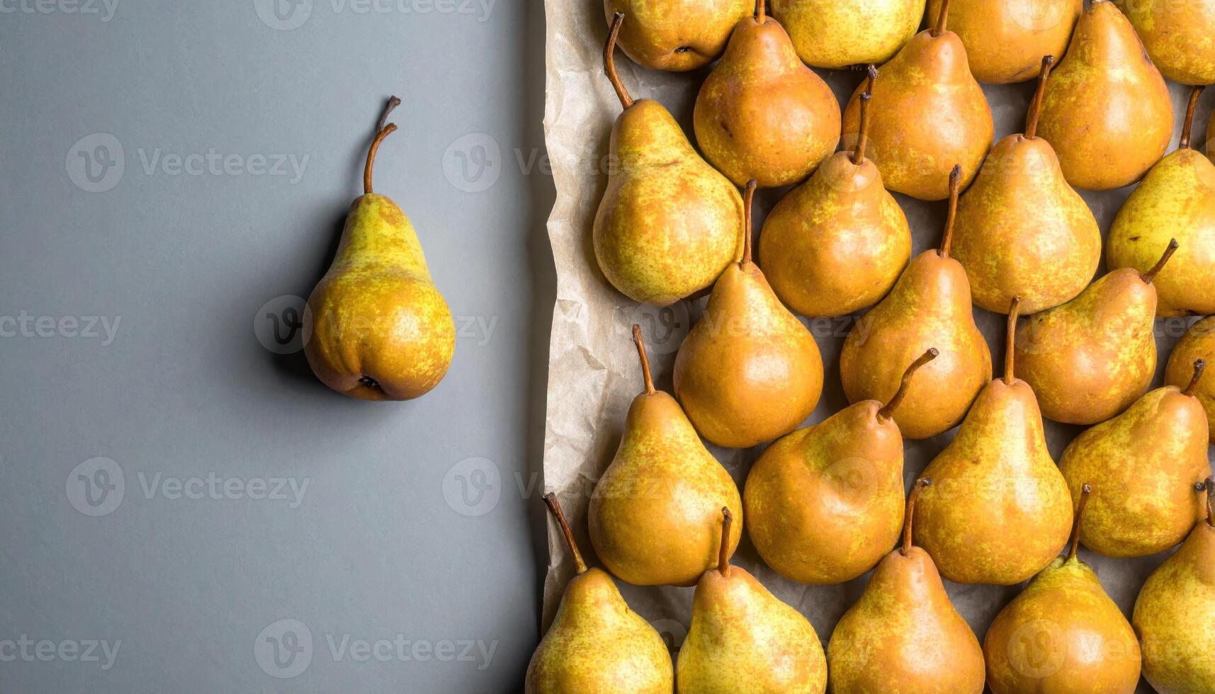 Seckel pears arranged as a gentle cluster with long elegant stems on paper grey refined orchard still life for editorial menus harvest features and calm branding Pro Photo