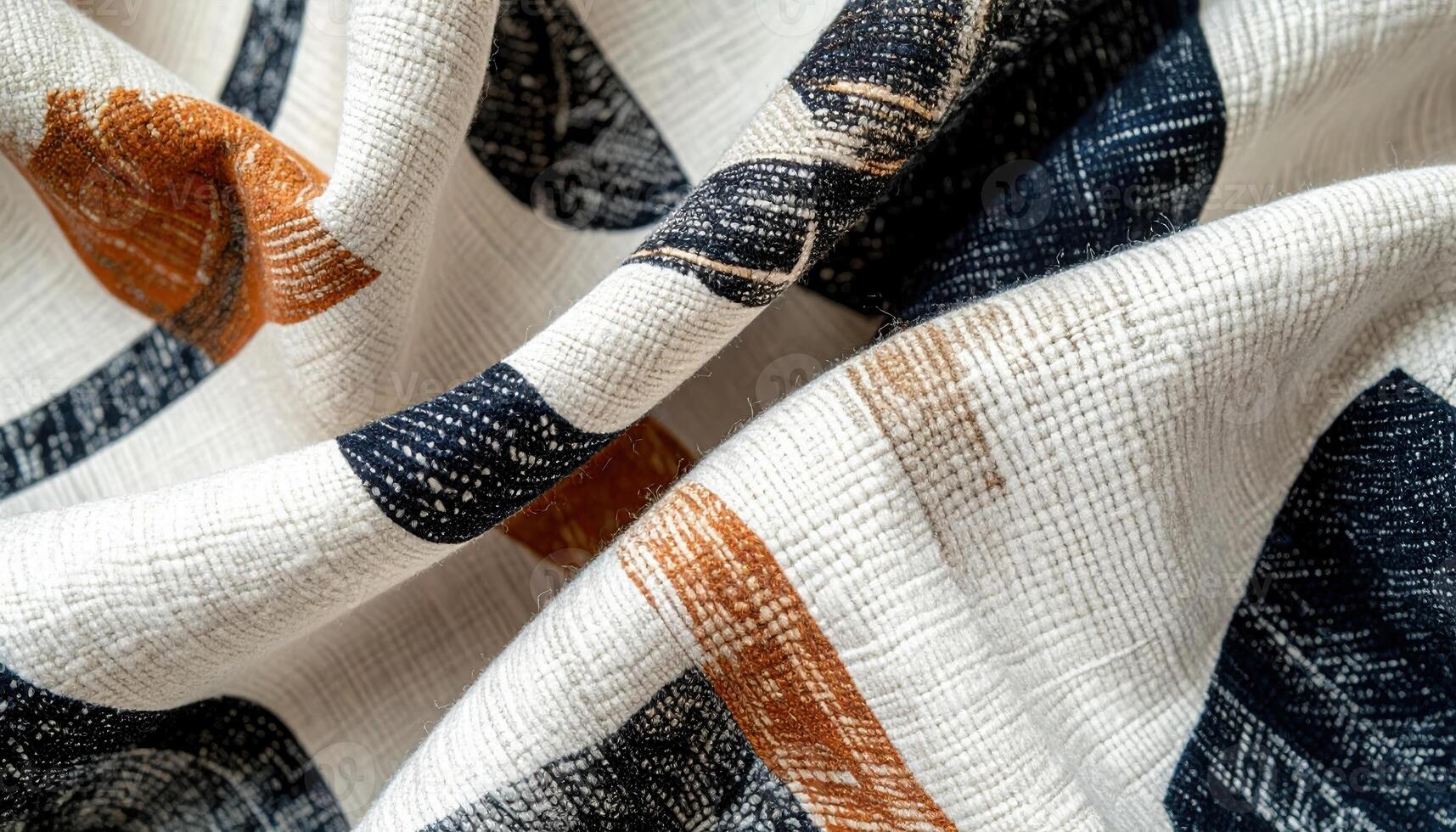 The textured fabric features a woven design with navy, brown, and white threads creating a geometric pattern, offe a rich, tactile surface for design applications. Pro Photo